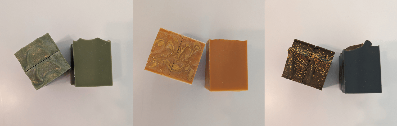 Olive Oil, Water, Cocoa Butter, Shea Butter, Coconut Oil, Castor Oil, Sodium Lactate, Sodium Hydroxide, Fragrance Oil, and Mica.